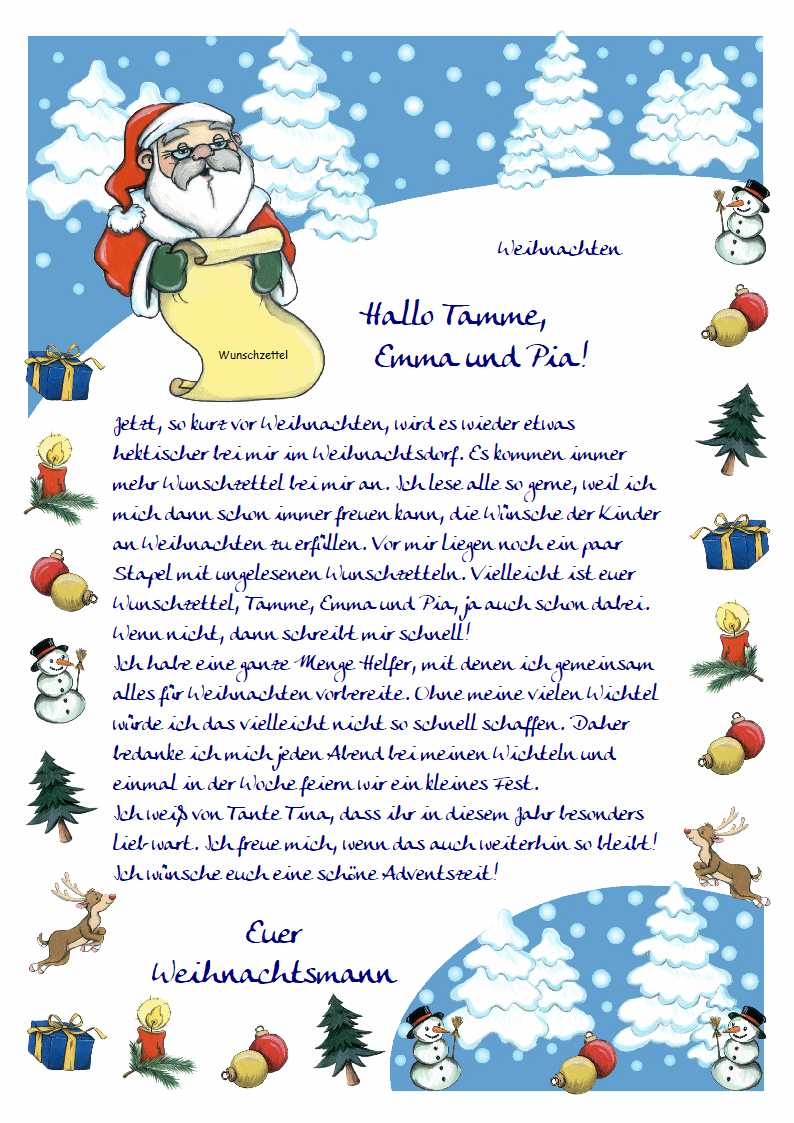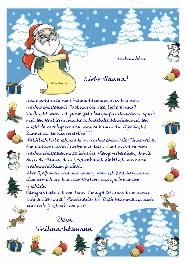 vielen herzlichen Dank für den schönen Weihnachtsbrief. Wir fanden ihn ganz toll, und meine Tochter hat sich sehr darüber gefreut, dass sie einen ganz eigenen Brief vom Weihnachtsmann bekommen hat!