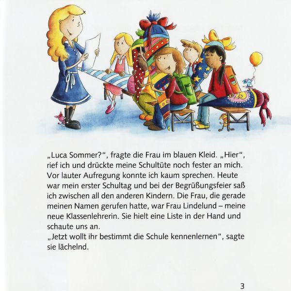 "Luca Sommer?", fragte die Frau im blauen Kleid. "Hier", rief ich und drückte meine Schultüte noch fester an mich. Vor lauter Aufregung konnte ich kaum sprechen. Heute war mein erster Schultag und bei der Begrüßungsfeier saß ich zwischen all den anderen Kindern. Die Frau, die gerade meinen Namen gerufen hatte, war Frau Lindelund - meine neue Klassenlehrerin. Sie hielt eine Liste in der Hand und schaute uns an.