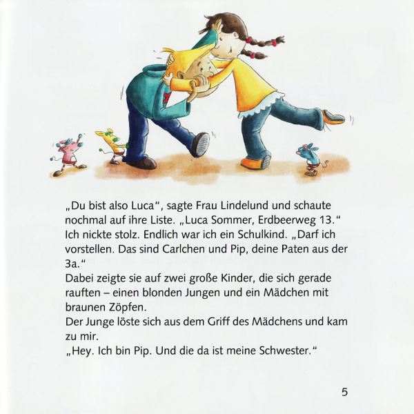 "Du bist also Luca", sagte Frau Lindelund und schaute nochmal auf ihre Liste. "Luca Sommer, Erdbeerweg 13." Ich nickte stolz. Endlich war ich ein Schulkind. "Darf ich vorstellen. Das sind Carlchen und Pip, deine Paten aus der 3a."