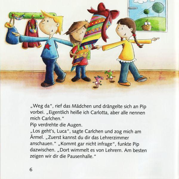 "Kommt gar nicht infrage", funkte Pip dazwischen. "Dort wimmelt es von Lehrern. Am besten zeigen wir dir die Pausenhalle."