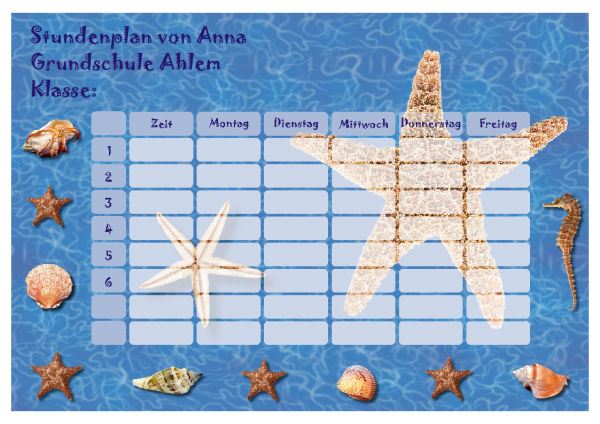 Mit dem wunderschönen Stundenplan macht die Schule Spaß! Im blauen Meer tummeln sich allerhand Seesterne und Muscheln.