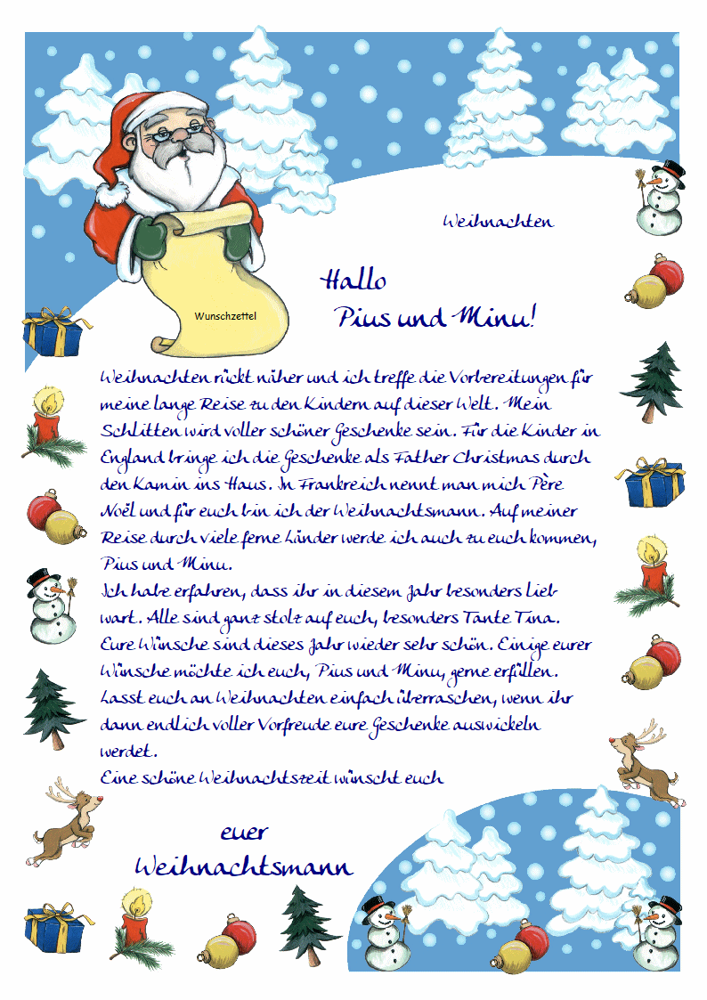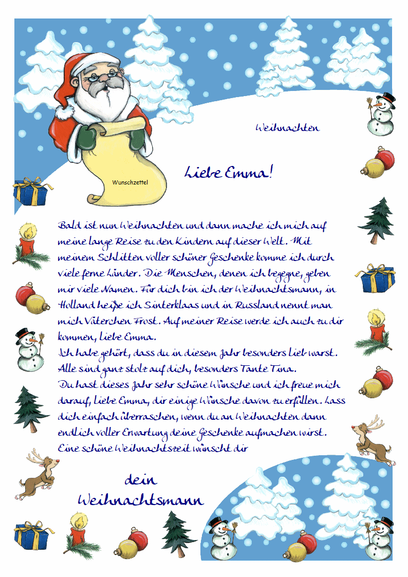 vielen herzlichen Dank für den schönen Weihnachtsbrief. Wir fanden ihn ganz toll, und meine Tochter hat sich sehr darüber gefreut, dass sie einen ganz eigenen Brief vom Weihnachtsmann bekommen hat!