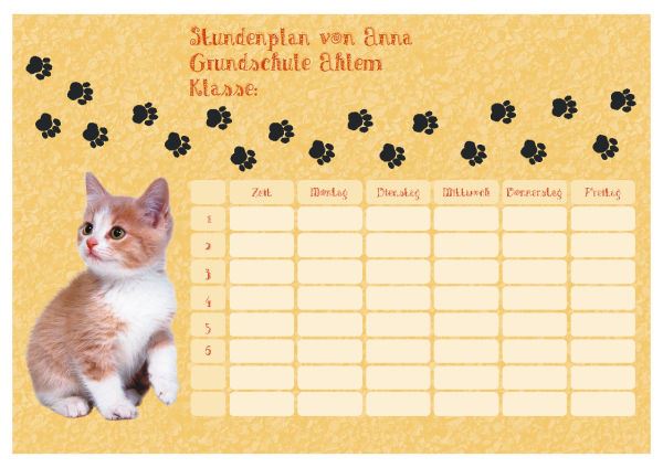 Mit dem wunderschönen Stundenplan macht die Schule Spaß! Ein kleines süßes Kätzchen tapst über das Blatt und hinterlässt ein paar Abdrücke mit ihren Pfoten.