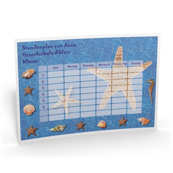 Mit dem wunderschönen Stundenplan macht die Schule Spaß! Im blauen Meer tummeln sich allerhand Seesterne und Muscheln.